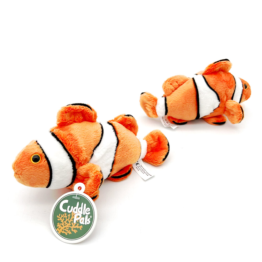 Dive into an ocean of cuddles with the Cuddle Buddies Clownfish! At 17.5cm long, this vibrant little fish is crafted from luxuriously soft velour fabric, making it a perfect companion for snuggling and play. Its bold orange and white stripes capture the beauty of the ocean, while its squishy polyester filling, with a sprinkle of plastic pellets, gives it a delightful huggable feel.